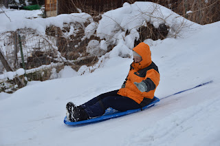 Since this post looks a little sad without any pictures at all, I shall post one of our last white Christmas, five years ago, when we had our magical sledding afternoon and Bitty was the one wearing the snowsuit that is now outgrown by Bundle.