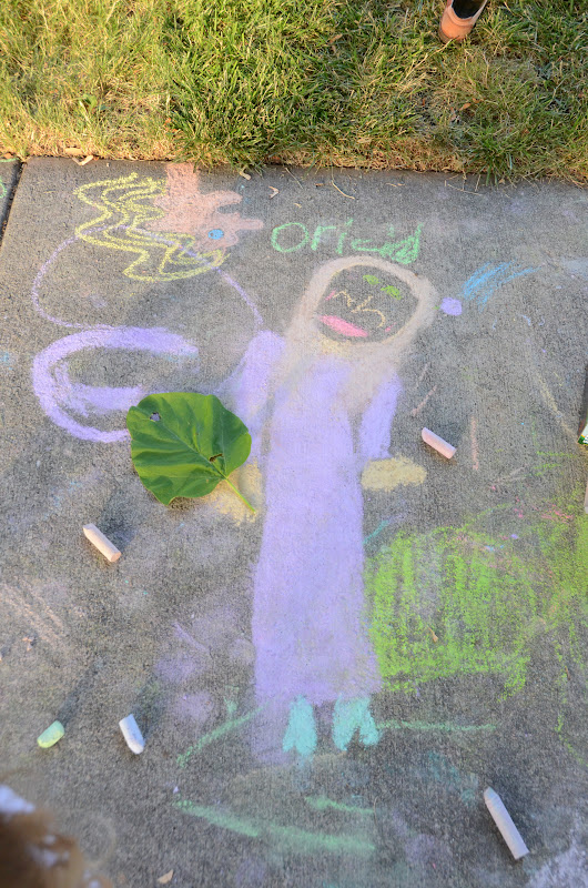 They didn't quite see the vision. Okay, we did have some nice time out on the front lawn, especially as the sun started to go down. My favorite drawing was done by a charming young lady named Daffodill who drew a life-sized friend whom she named Orchid. Super cute. But it wasn't quite the fest I was going for. Maybe I need to just live my dream and decorate my own sidewalk all by myself. The neighbors and probably my family too will think I'm nuts but I don't really care - it will fulfill my obsession with chalk art and help me stop trying to make the kids in the neighborhood do it for me.