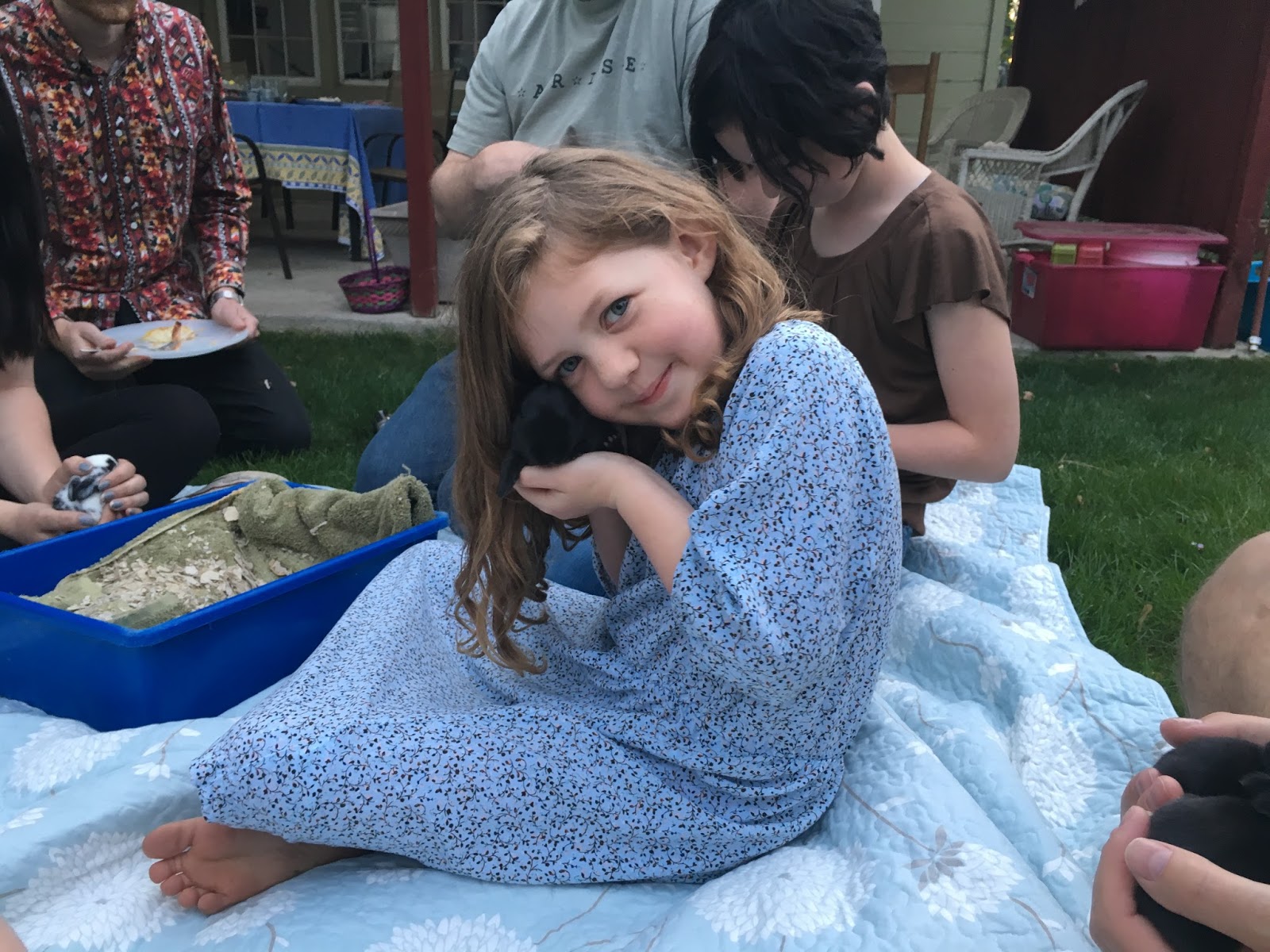 Then we had our first-ever experience with real Easter magic. Turns out that my niece Kate and her boyfriend Cameron run a business raising rabbits. And one rabbit had just had babies. So after dinner they went and fetched a whole bunch of little easter bunnies for us. Oh my cuteness times a billion. If the bunnies could stay that size I would be all over owning one. Big bunnies are mean. I'm not a fan. But these little handfuls of fuzzy love? I wish. We even called up Emily and co. to come get some bunny-time too.